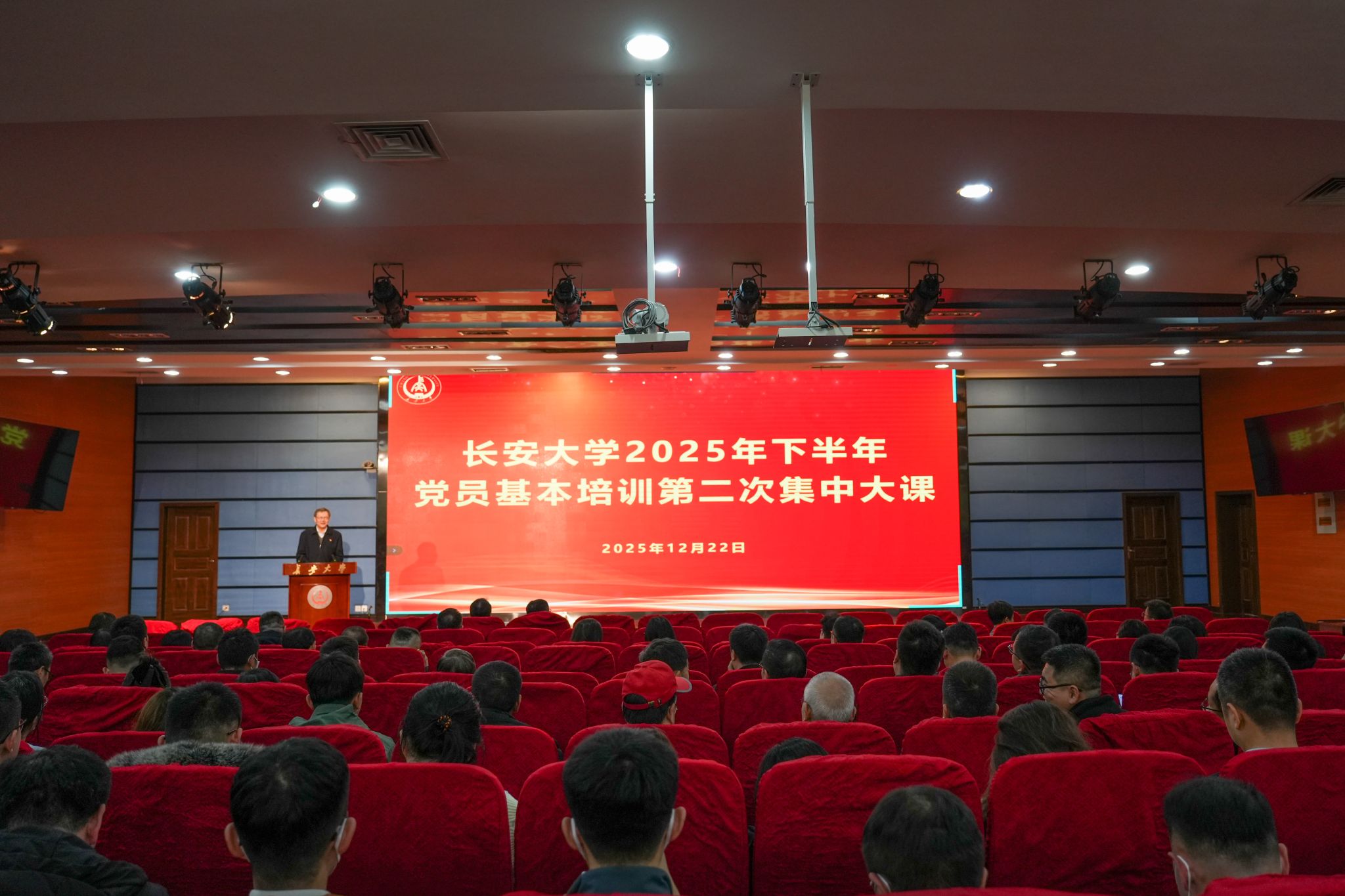 12月22日晚,长安大学举行2025年下半年党员基本培训第二次集中大课,集中学习南方科技大学校长、中国科学院院士薛其坤所做的《追求卓越 矢志报国——在新征程上践行共产党员的初心与使命》视频报告。全校近1万名党员分别于北校区主会场和65个分会场同步参加培训。校党委书记陈志坚主持学习,省委教育工委派员列席。