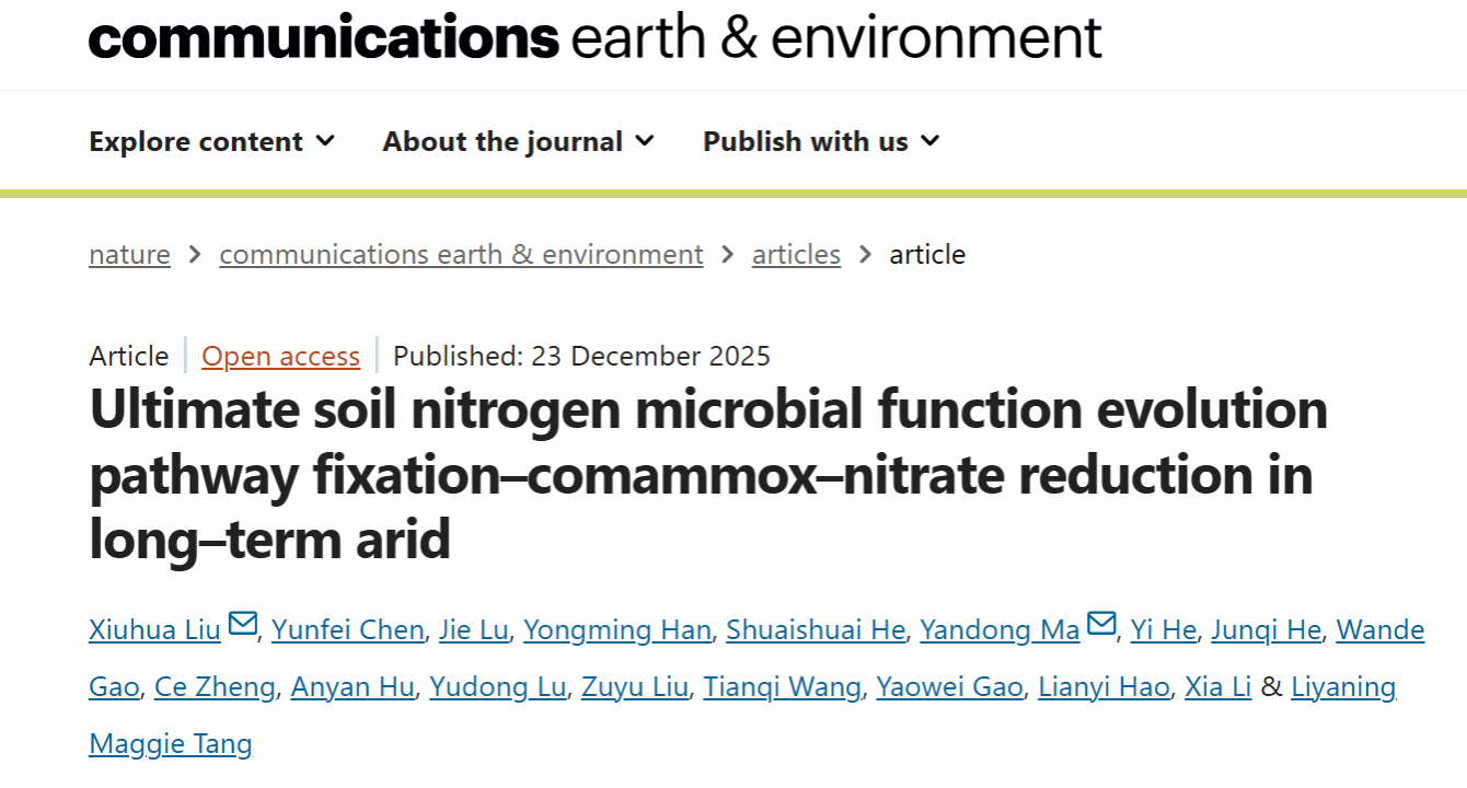 12月23日,我校水环学院刘秀花教授团队在Nature子刊《地球与环境通讯》(Communications Earth & Environment)发表题为“Ultimate soil nitrogen microbial function evolution pathway fixation–comammox–nitrate reduction in long–term arid” 的最新研究成果。该成果首次证明:在长期干旱压力下,土壤微生物群落为适应氮素限制演化出一条独特的终极功能路径:固氮-完全氨氧化-硝酸盐还原循环。长安大学黄土科学国家重点实验室为论文第一完成单位,刘秀花教授与陕西省林科院马延东副研究员为共同通讯作者。合作者包括中科院地环所韩永明研究员、澳大利亚纽卡斯尔大学Maggie Tang副教授等。