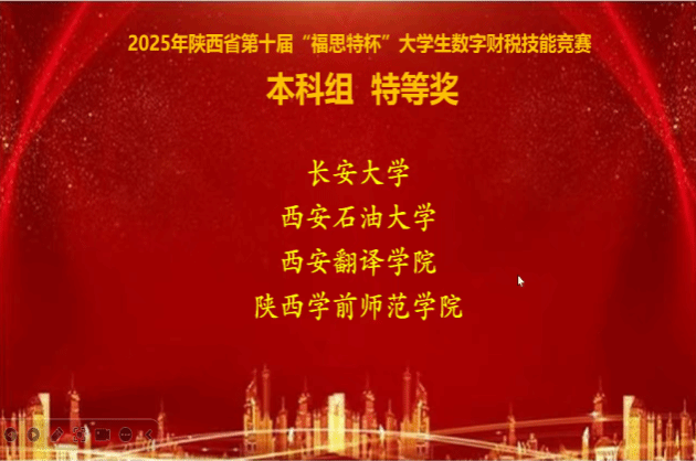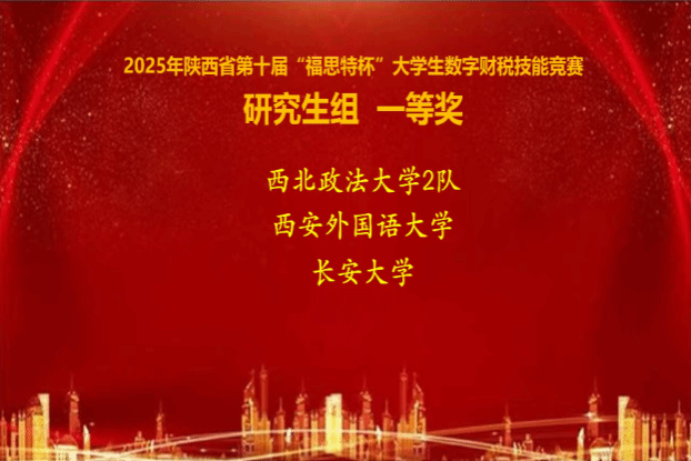 11月8日,陕西省第十届“福思特杯”大学生数字财税技能竞赛,在西北政法大学举行。经济与管理学院2023级会计学专业本科生陈丹丹、叶满钰、翁馨怡、张海诺组成的本科生团队和2025级会计学专业硕士研究生王志龙阳、王文瑄、陈茵、何艳组成的研究生团队代表学校参赛,并最终获得本科组特等奖、研究生组一等奖的好成绩。会计系教师李辽宁、郭慧婷、卫静获评“优秀指导教师”。