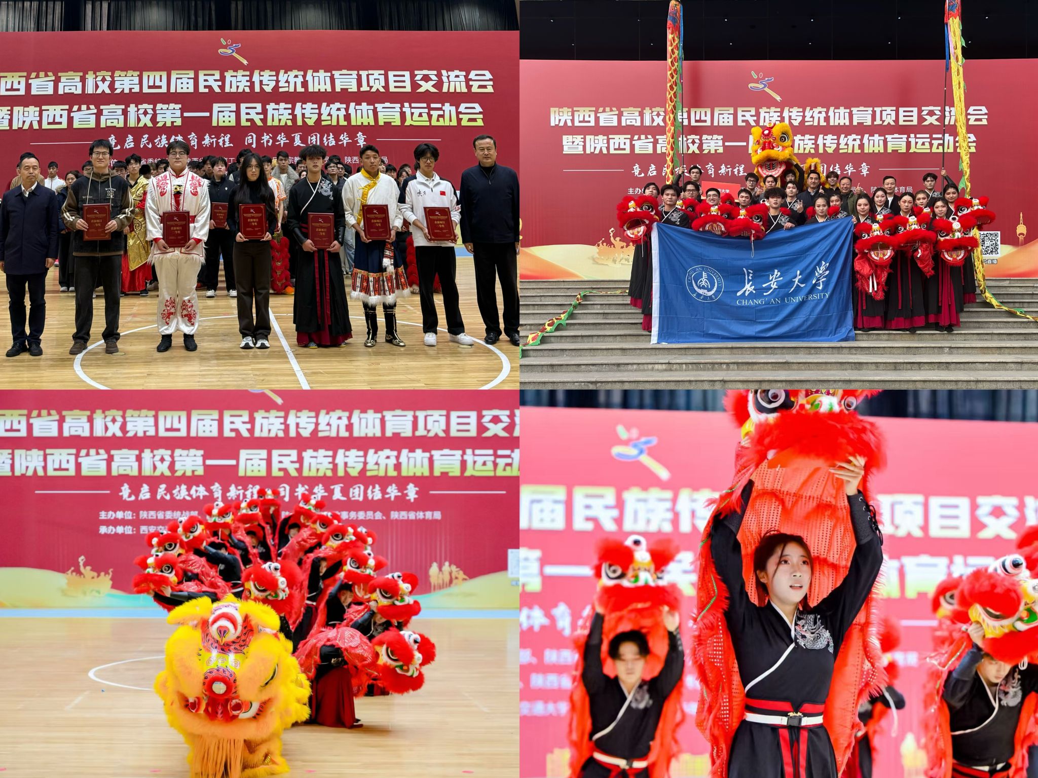 11月8日,由中共陕西省委统战部、中共陕西省委教育工委、陕西省民族宗教事务委员会、陕西省体育局主办,西安交通大学、陕西省学生体育协会民族传统体育专业委员会承办的“竞启民族体育新程 同书华夏团结华章”陕西省高校第四届民族传统体育项目交流会暨陕西省高校第一届民族传统体育运动会在西安交通大学举办。我校选派的《醒狮跃九韶》荣获表演项目二等奖。