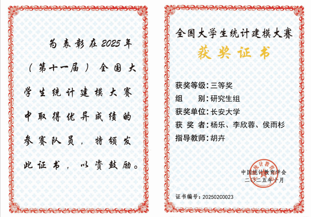 近期,由中国统计教育学会主办、东北财经大学承办的2025年第十一届全国大学生统计建模大赛在东北财经大学举行。长安大学经济与管理学院本科生参赛团队荣获国家级一等奖1项、运输学院研究生参赛团队荣获国家级三等奖1项。