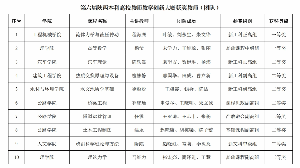 12月4日,陕西省教育厅公布第六届陕西本科高校教师教学创新大赛获奖教师(团队)名单,我校参赛教师(团队)共获得10项奖励,其中一等奖2项、二等奖7项、三等奖1项。