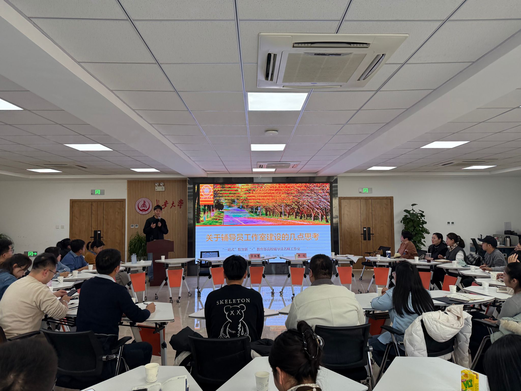 为扎实推进辅导员工作室专业化、品牌化建设,搭建经验交流与实践探索的创新平台,12月26日下午,我校第四十三期辅导员沙龙在朝晖园示范性园区二层团体辅导室举行。本期沙龙以“辅导员工作室品牌建设与特色发展”为主题,特邀首批教育部高校辅导员名师工作室“红色基因”辅导员工作室主持人、西北大学辅导员常雅慧,教育部高校辅导员名师工作室“一站式”数智新“+”辅导员工作室主持人、西安工程大学校团委创新实践部部长黄冠担任主讲嘉宾。沙龙由心理健康教育与咨询中心副主任刘飞主持,我校各辅导员工作室主持人及核心成员40余人参加。