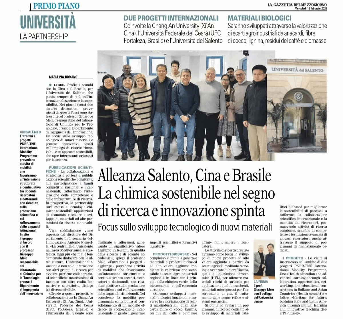 近日,意大利最具影响力的日报之一《La Gazzetta del Mezzogiorno (南方公报)》对长安大学水利与环境学院与意大利萨兰托大学创新工程学院近期开展的多维度实质性合作系列成果进行了专题报道。此次报道是对两校多年合作成效的重要国际认可,标志着长安大学的国际合作成果迈上了新台阶,成为中意高等教育交流合作的典型案例。