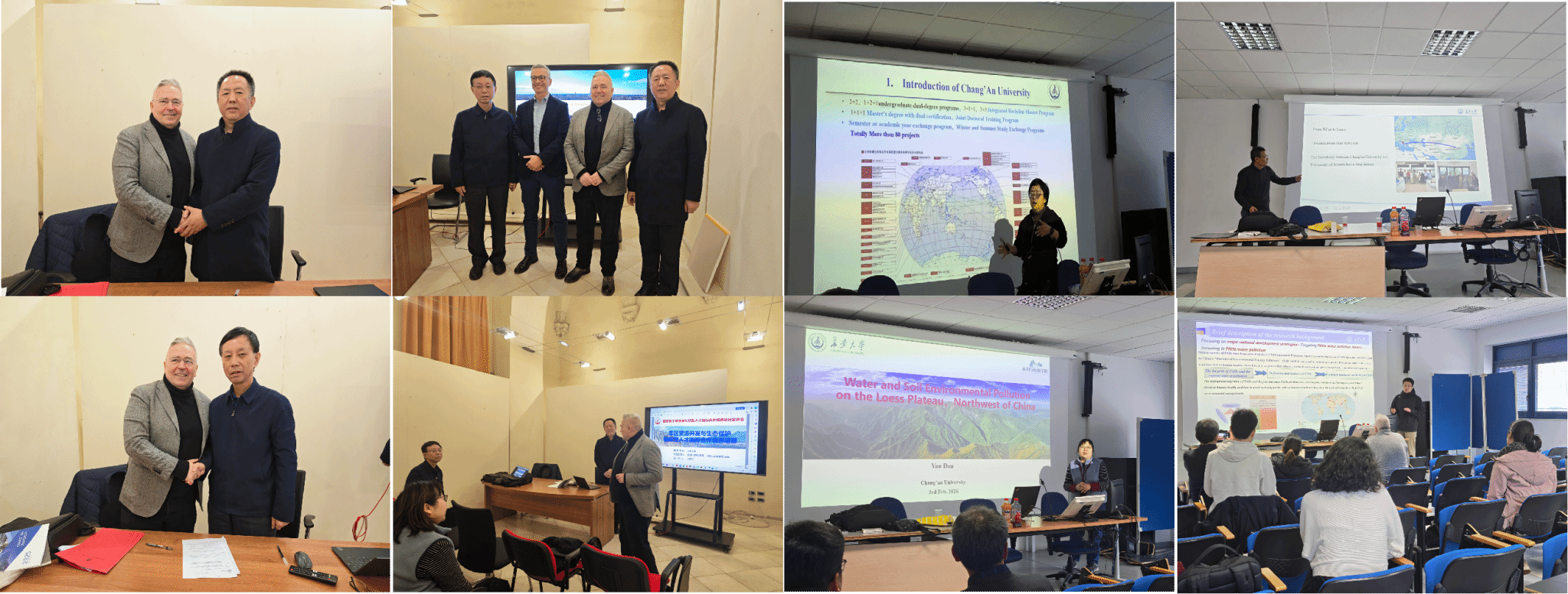 1月25日至2月6日,在欧盟TNE国际合作交流项目和国家留学基金委公派专项项目共同支持下,长安大学水利与环境学院院长白波教授率领学院教师赴意大利萨兰托大学开展交流访问。在双方长期合作基础上,推动中意双边实质合作进一步深化。访问期间,双方就联合科研平台建设、教师互访常态化、联合人才培养等核心合作事项达成广泛共识,现场签署多项合作框架协议,完善了中意硕士双学位联合培养项目落地框架,为双方多领域长期合作奠定了坚实的制度基础。学术交流环节,双方围绕水利、环境、化工及材料多领域前沿研究方向开展成果分享与深入研讨,在关键科学问题研究、技术转化、联合科研等方面形成多项共识,进一步拓宽了双方科研合作边界。