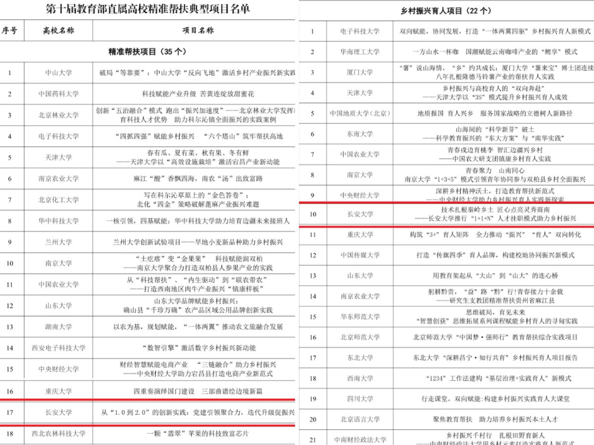 近日,第十届教育部直属高校精准帮扶典型项目推选结果正式公布,我校申报的精准帮扶项目《从“1.0到2.0”的创新实践:党建引领聚合力,迭代升级促振兴》和乡村振兴育人项目《技术扎根秦岭乡土 匠心点亮灵秀商南—长安大学推行“1+1+N”人才挂职模式助力乡村振兴》,从教育部直属高校参评的107个案例中脱颖而出、成功入选。我校已连续四届、累计7个项目成功入选教育部直属高校精准帮扶典型项目,彰显了教育部对学校深耕商南定点帮扶工作、创新帮扶模式、深化校地协同育人成效的充分认可,体现了学校持续发挥学科优势、助力乡村振兴的显著成效。