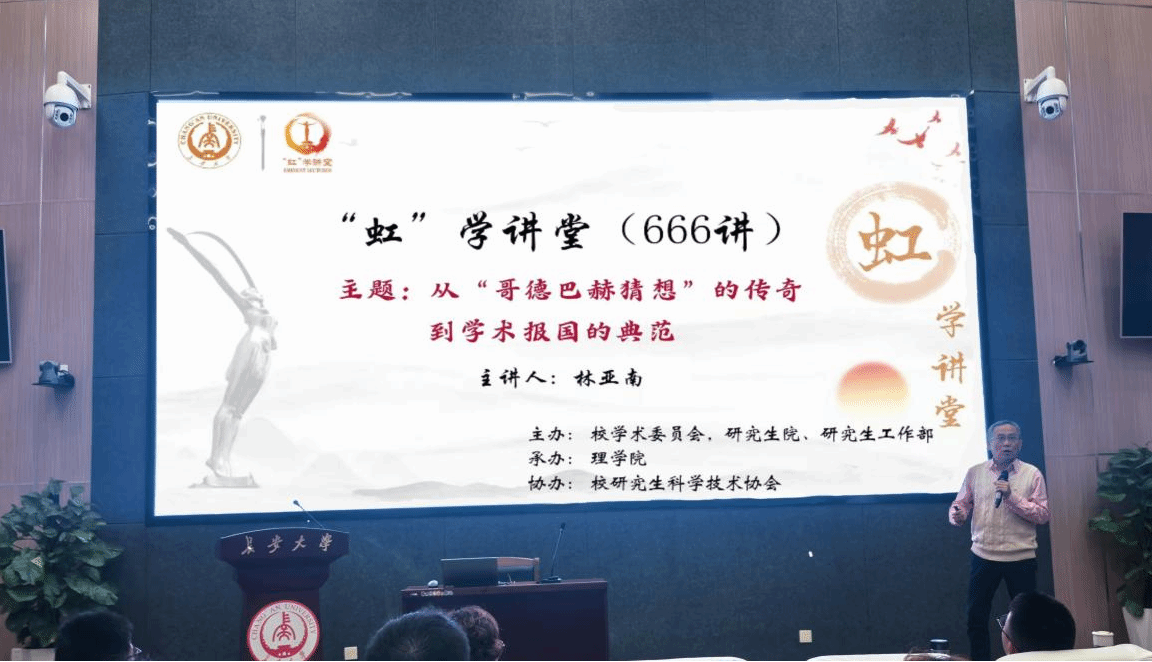 10月17日下午,由校学术委员会和研究生院、研究生工作部主办,理学院承办,校研究生科学技术协会协办的“虹”学讲堂第666讲在北校区师生服务大厅二层第二报告厅举行。厦门大学林亚南教授作题为“从‘哥德巴赫猜想’的传奇到学术报国的典范”的报告,理学院邓庆田教授主持报告会,相关学院共150余名师生参加讲座。