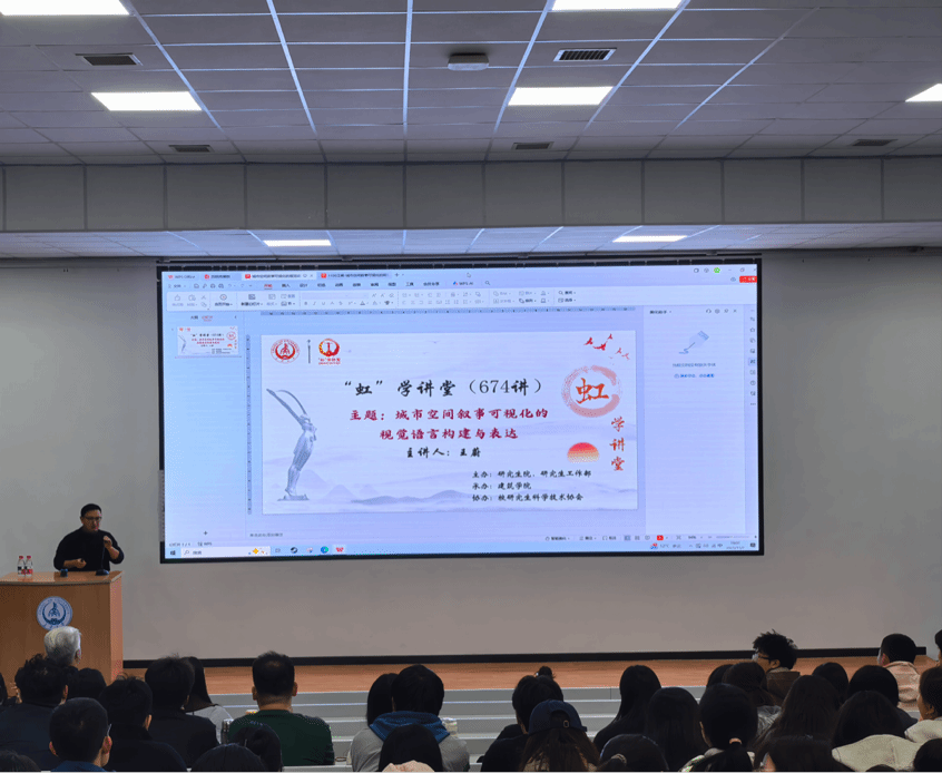 11月7日晚,由研究生院、研究生工作部主办,建筑学院承办,校研究生科学技术协会协办的“虹”学讲堂第674讲在南校区西院科技开发楼报告厅举行。湖南大学王蔚教授作题为“城市空间叙事可视化的视觉语言构建与表达”的报告,建筑学院白骅教授主持报告会,相关学院共160余名师生参加讲座。