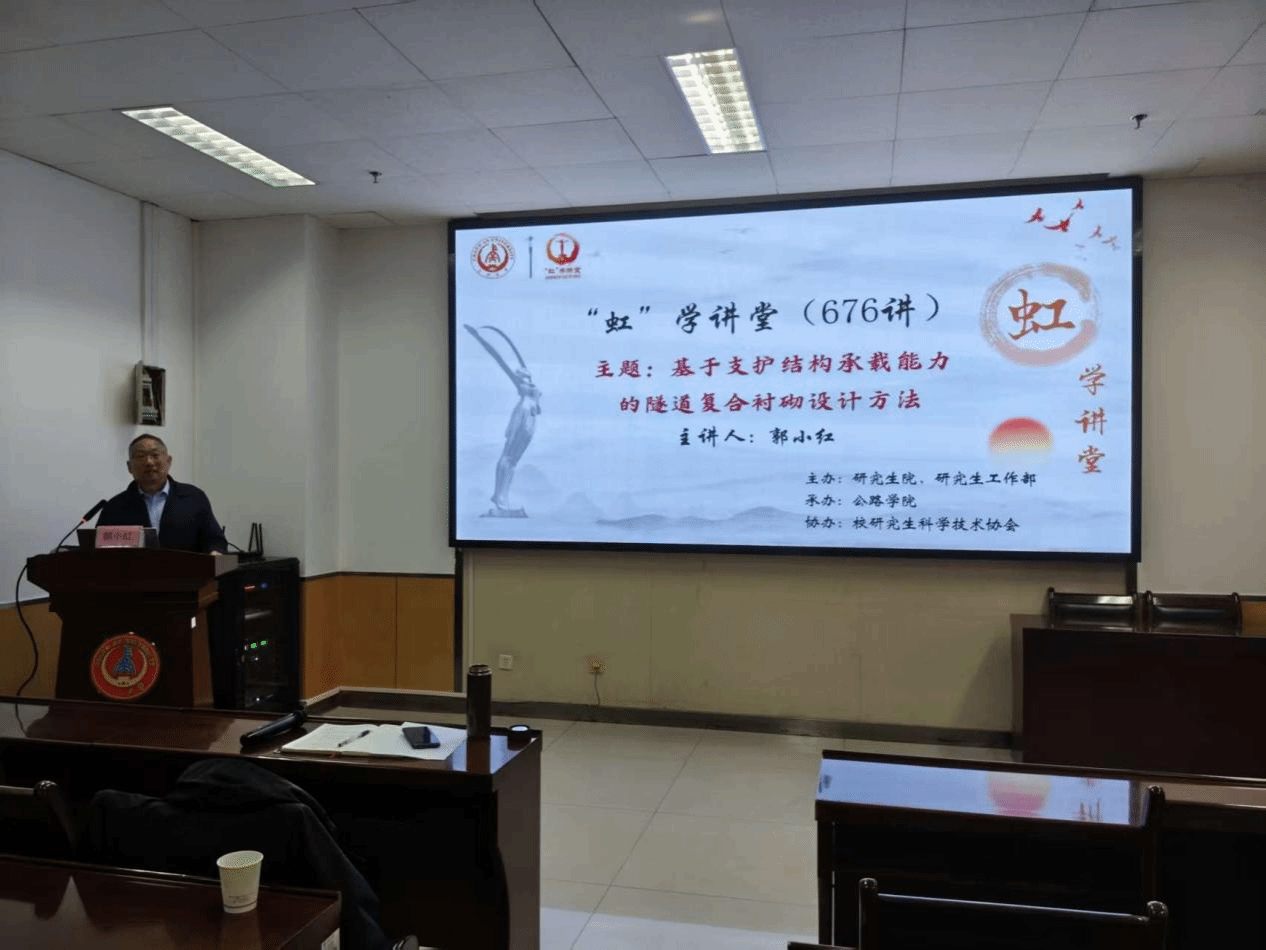 11月11日上午,由研究生院、研究生工作部主办,公路学院承办,校研究生科学技术协会协办的“虹”学讲堂第676讲在南校区北院交通科技大厦602室举行。中建一局郭小红教高作了题为“基于支护结构承载能力的隧道复合衬砌设计方法”的报告,公路学院罗彦斌教授主持,相关学院共100余名师生参加讲座。