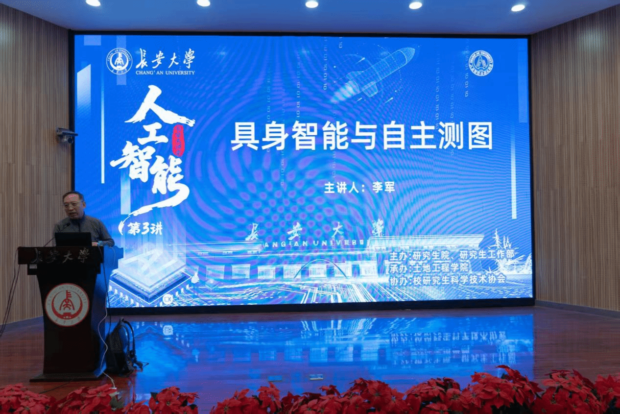 11月14日上午,由研究生院、研究生工作部主办,土地工程学院承办,校研究生科学技术协会协办的“人工智能”长安大讲堂第3讲在南校区东院伯声报告厅举行。加拿大滑铁卢大学李军教授作题为“具身智能与自主测图”的报告,土地工程学院韩玲教授主持报告会,相关学院共180余名师生参加讲座。