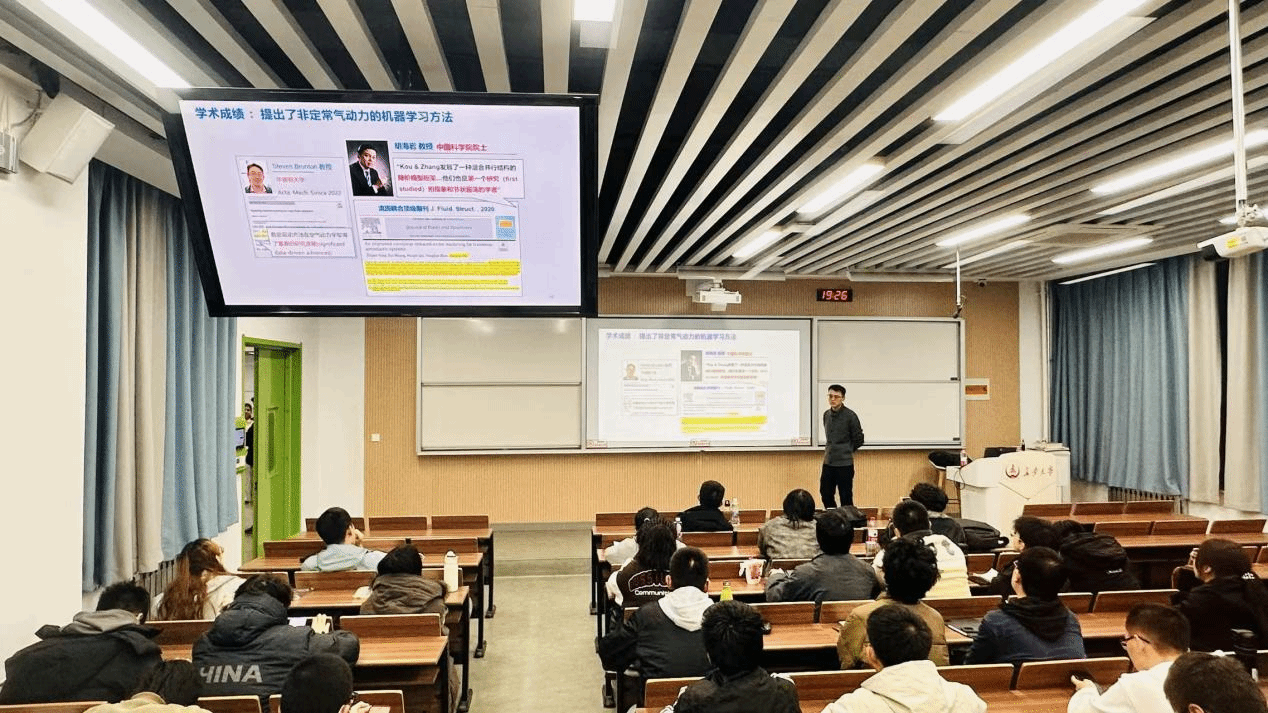 寇家庆从人工智能深度赋能传统工程学科的时代背景切入,指出智能流体力学已成为流体力学前沿热点。他结合自身科研历程,生动阐释了如何从阅读文献中凝练科学问题——“飞行器复杂流动的高效高精度预示与建模”,并系统介绍了其团队在高阶浸没边界法、数据驱动流场模态分析、非定常气动力机器学习方法等方向取得的创新成果。他强调,这些前沿研究与本科生正在修读的数学、物理、力学等基础课程紧密相连,鼓励学生扎实学好基本功,勇于探索学科交叉地带。