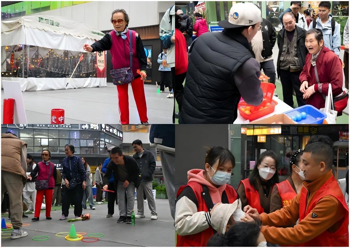 在趣味游戏互动环节,彩球分拣、夹豆子、投壶、套圈等游戏吸引众多长者踊跃参与,志愿者们全程陪伴协助,广场上笑语不断,现场气氛热烈而有序。