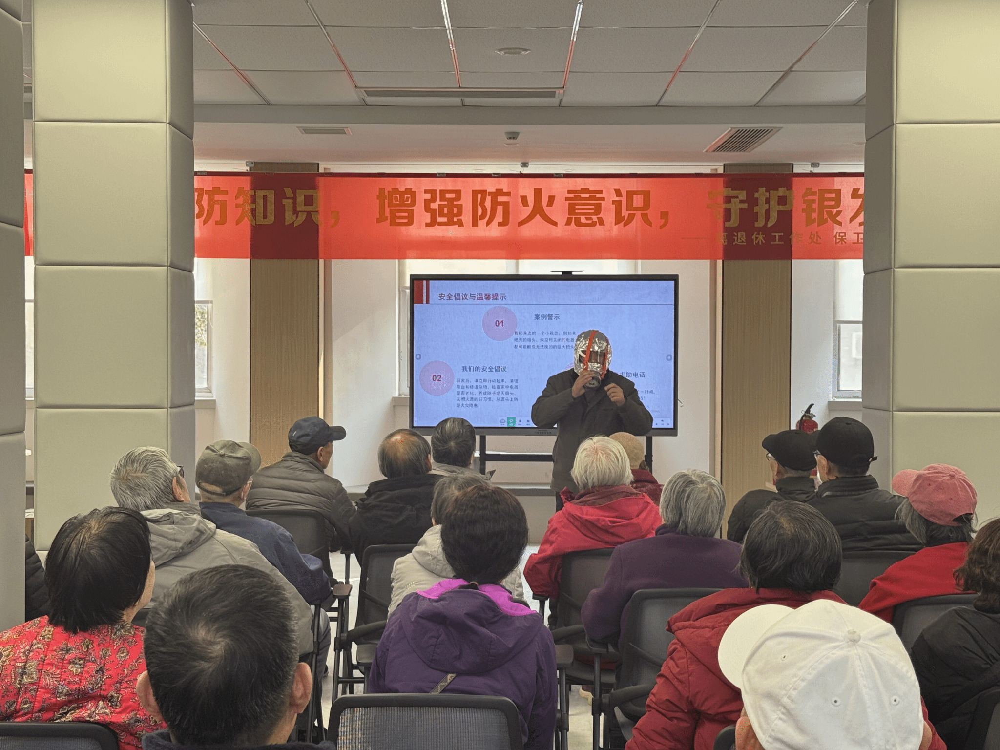随后,保卫处(保卫工作部)干部围绕火灾预防、逃生自救、案例警示三大核心内容展开培训,结合居家用电、用气、取暖等高频风险点,细致讲解隐患排查与日常防范要点;针对老年群体行动特点,实操教学灭火器“提、拔、瞄、喷”规范流程及防毒面具正确佩戴步骤,确保老年朋友们掌握基础应急装备使用技能;通过典型居家火灾案例复盘,剖析卧床吸烟、私拉乱接电线等危险行为危害,让老年朋友们直观感受火灾风险。
