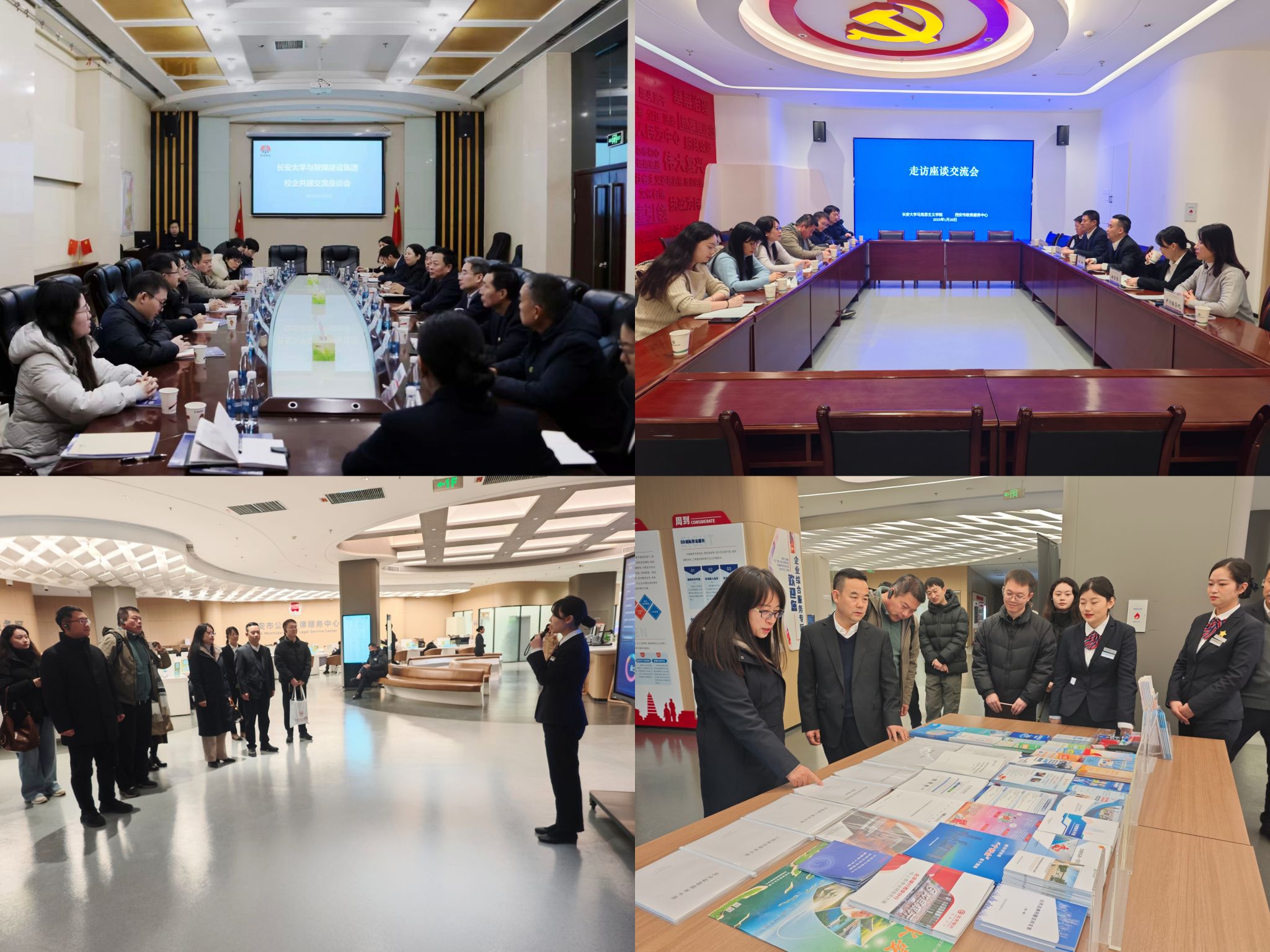 在走访过程中,陕煤建设集团党委委员、纪委书记徐五才,西安市政务服务中心主任张𮧵对学院一行的到访表示热烈欢迎。座谈会上,李小芹向用人单位详细介绍了学校学院基本情况、学院师资科研优势和人才培养模式等情况,用人单位从自身发展历程、业务范围及人才招聘需求进行了介绍。双方围绕人才培养、实习实践基地建设、产学研合作等方面进行了深入交流,共同探索多层次资源共享机制,致力于实现优势互补与协同发展。