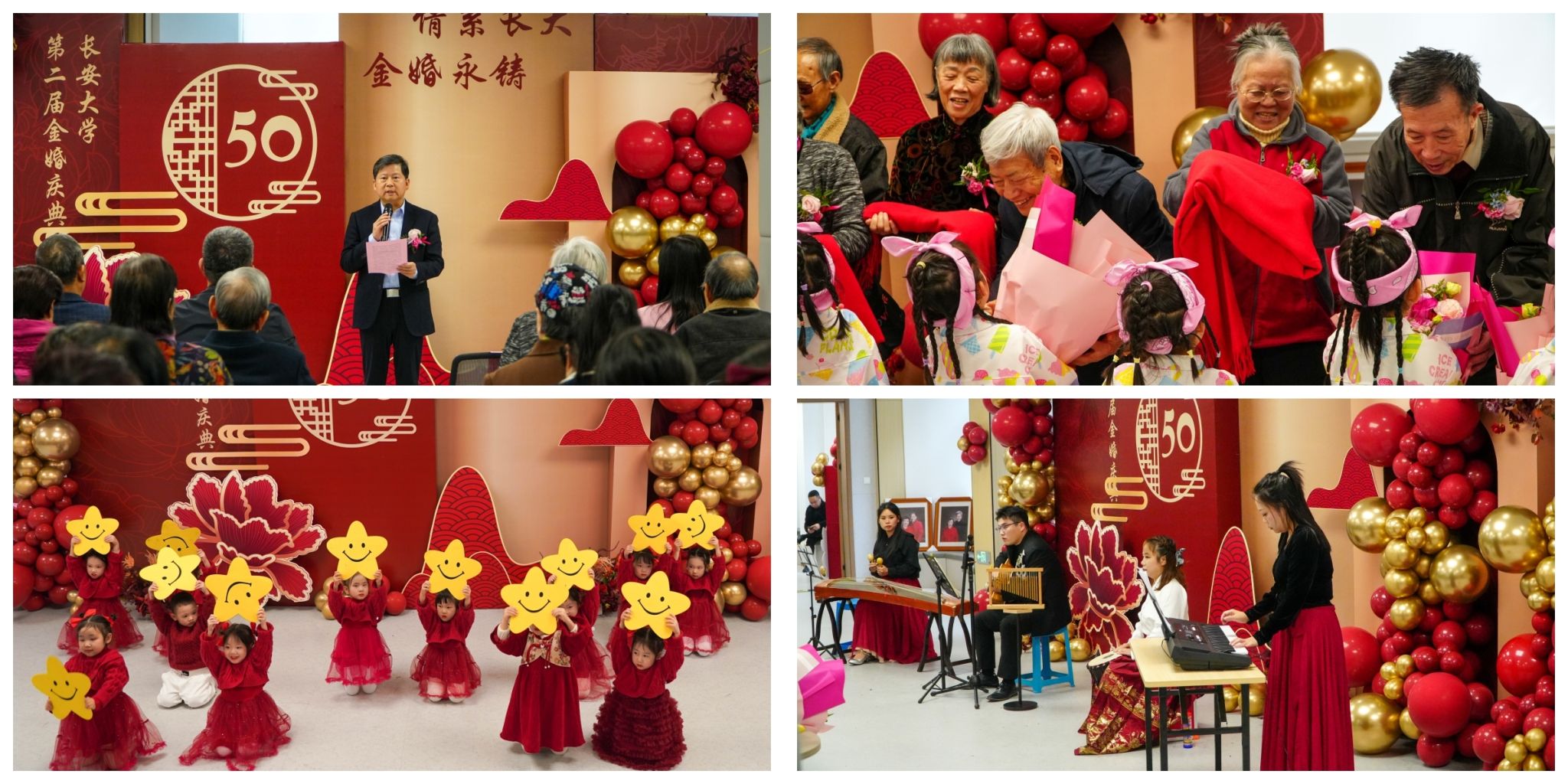 为弘扬中华民族传统美德,倡导和谐婚姻家庭观念,表达学校对老同志的温馨关怀,10月22日,“情系长大 金婚永铸”长安大学第二届金婚庆典在南校区师生活动中心一楼多功能室举行,副校长黎开谊出席活动并致辞,离退休工作处班子成员、翠华幼儿园园长王珩、17对金婚夫妇、老同志代表、幼儿园老师和小朋友代表参加活动。活动由离退休工作处处长薛庆文主持。