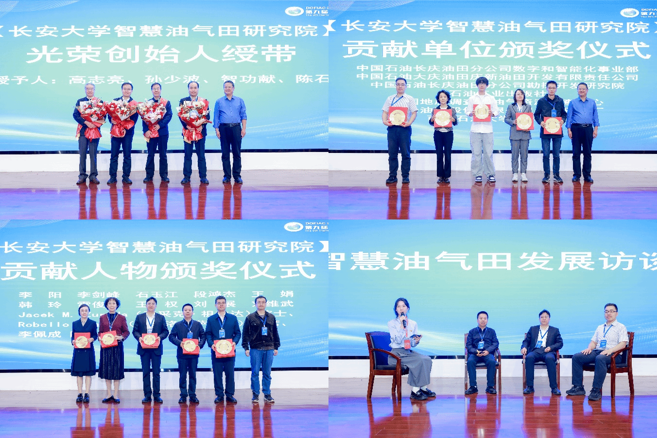 会议同期举行了智慧油气田研究院成立20周年庆典,回顾其自2005年数字油田研究所起步,到如今成为领域内重要研究机构的奋斗历程。研究院院长付国民教授为高志亮、陈石、孙少波、智功献等四位创始人献花绶带,并向中国石油长庆油田分公司数字和智能化事业部等7家贡献单位、李阳院士等14位贡献人物颁奖,致谢各界同仁长期支持。庆典环节由长安大学地球科学与资源学院副院长李佐臣教授主持。