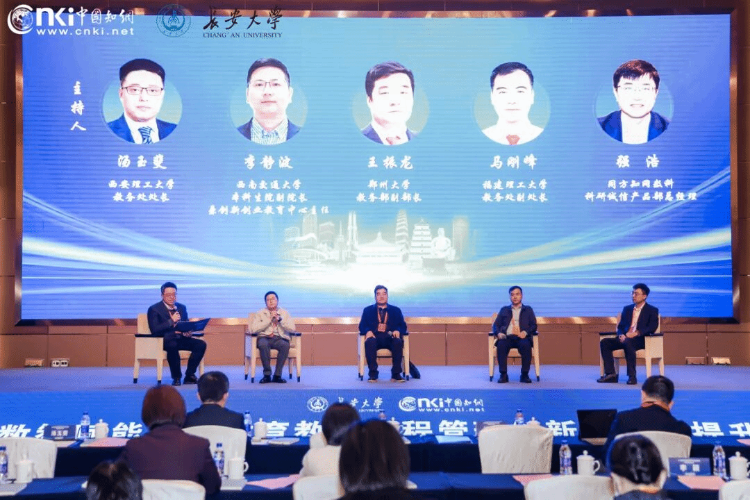 圆桌论坛环节,在西安理工大学教务处处长汤玉斐主持下,西南交通大学本科生院副院长兼创新创业教育中心主任李静波、郑州大学教务部副部长王振龙、福建理工大学教务处副处长马刚峰、同方知网数科科研诚信产品部总经理强浩等嘉宾就AI在教育教学领域的融合应用、人工智能技术助力教学提质增效、AI教育治理体系建设、教学过程管理实践、学术诚信底线坚守等方面展开深入对话与探讨。